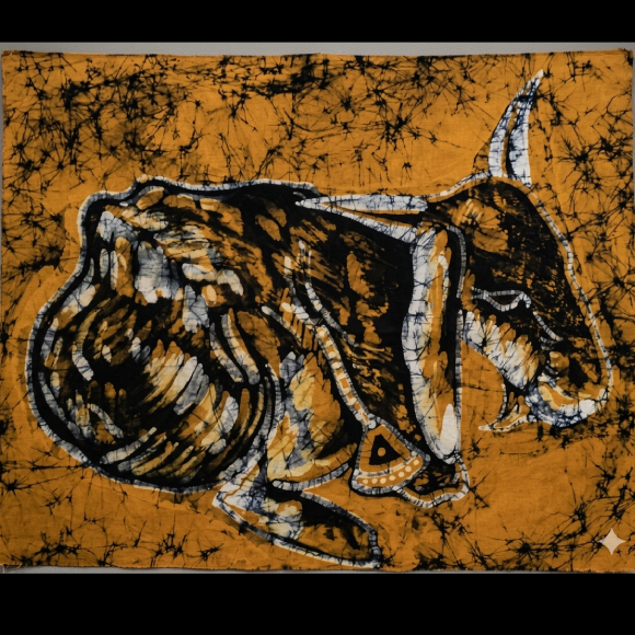 The artist has masterfully utilized the wax-resist batik method on cotton fibre, allowing for a rich “crackle” texture to permeate the background. This effect, combined with the bold, sweeping lines of the animal’s form, creates a dynamic sense of life and character. The long, horizontal 8″ x 24″ format makes it a unique statement piece that adds a touch of soulful tradition to any modern or ethnic-inspired interior.