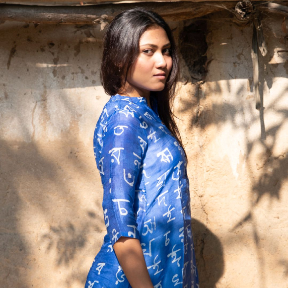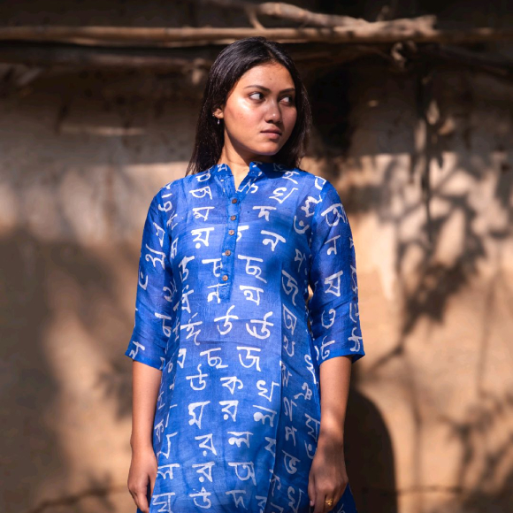 The dress serves as a canvas for the “Borno Mala” (Alphabet) motif, featuring intricate Bengali calligraphy brought to life through the traditional Hand Batik process. Each character is hand-blocked with wax before being submerged in fermented natural indigo vats, ensuring a piece that is as much a work of art as it is a garment.